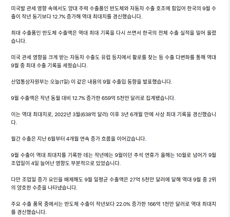 "트럼프 압박" 속에서도 9월 수출 '역대 최대' 659억 달러…반도체·자동차 '쌍끌이' News2025. 10. 1. 10:06