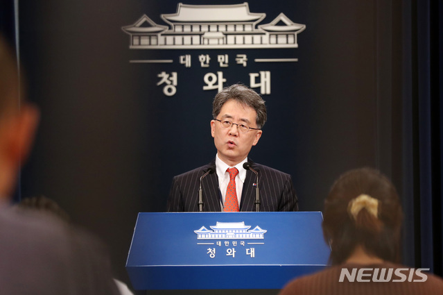 [서울=뉴시스]박영태 기자 = 김현종 국가안보실 2차장이 28일 청와대 춘추관 대브리핑룸에서 한-미 미사일 지침과 관련해 "우주발사체 고체 연료 사용 제한을 완전히 해제"한다는 브리핑을 하고 있다. 2020.07.28.since1999@newsis.com
