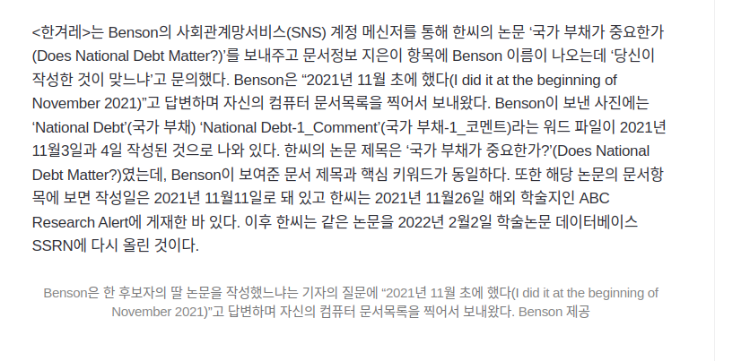 또한 지난 4일 <한겨레>의 ‘한동훈 딸, 고1 때 두 달간 논문 5개·전자책 4권 썼다’ 보도 이후 “3년에 걸쳐 학교 리서치 과제, 고교 대상 에세이 대회 등을 통해 작성한 에세이, 보고서, 리뷰 페이퍼 등을 모아 2021년 11월경 이후 한꺼번에 오픈액세스 저널이 요구하는 형식에 맞게 각주, 폰트 등을 정리해 업로드한 것”이라고 밝혔다.