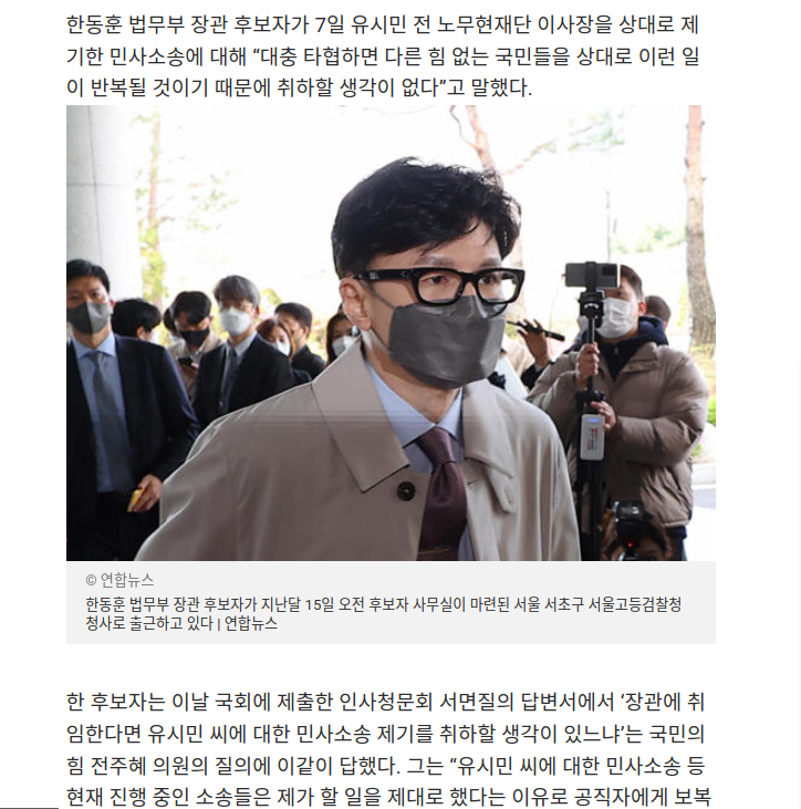 7일 유시민 전 노무현재단 이사장을 상대로 제기한 민사소송에 대해 “대충 타협하면 다른 힘 없는 국민들을 상대로 이런 일이 반복될 것이기 때문에 취하할 생각이 없다”고 한동훈 법무부 장관 후보자는 말했다.