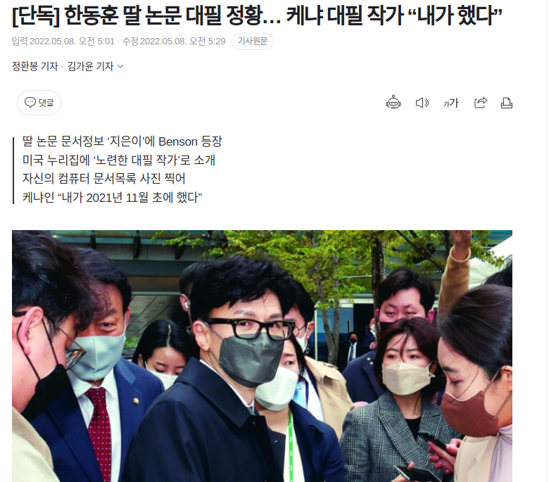 [단독] 한동훈 딸 논문 대필 정황… 케냐 대필 작가 “내가 했다”
