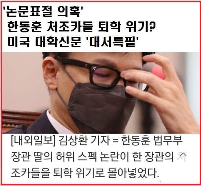 한동훈 처조카, ‘논문 표절' 의혹 소명 못하면 최소 ‘퇴학’ 불가피 News2022. 8. 20. 09:26