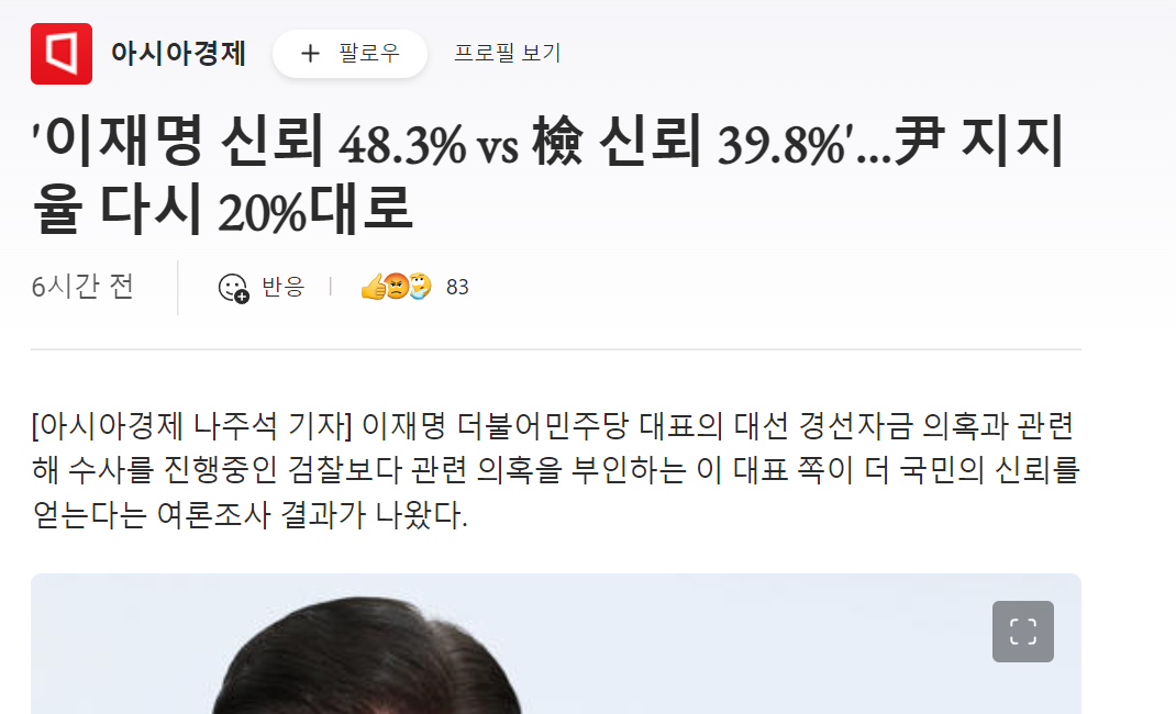 '이재명 신뢰 48.3% vs 檢 신뢰 39.8%'…尹 지지율 다시 20%대로 (msn.com)