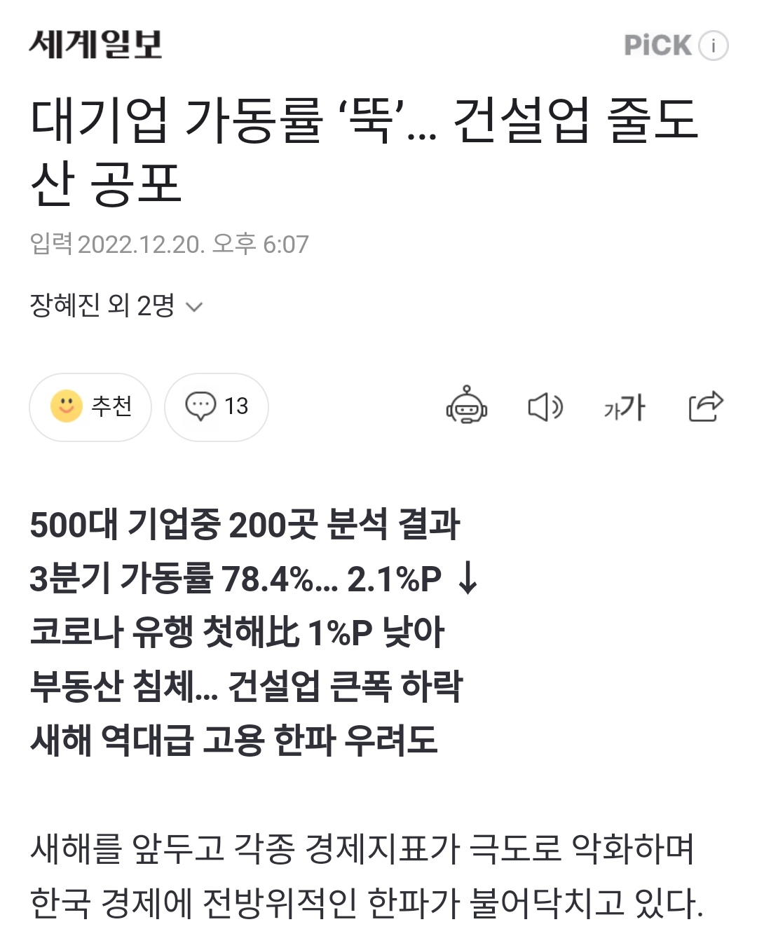 대기업 가동률 ‘뚝’… 건설업 줄도산 공포