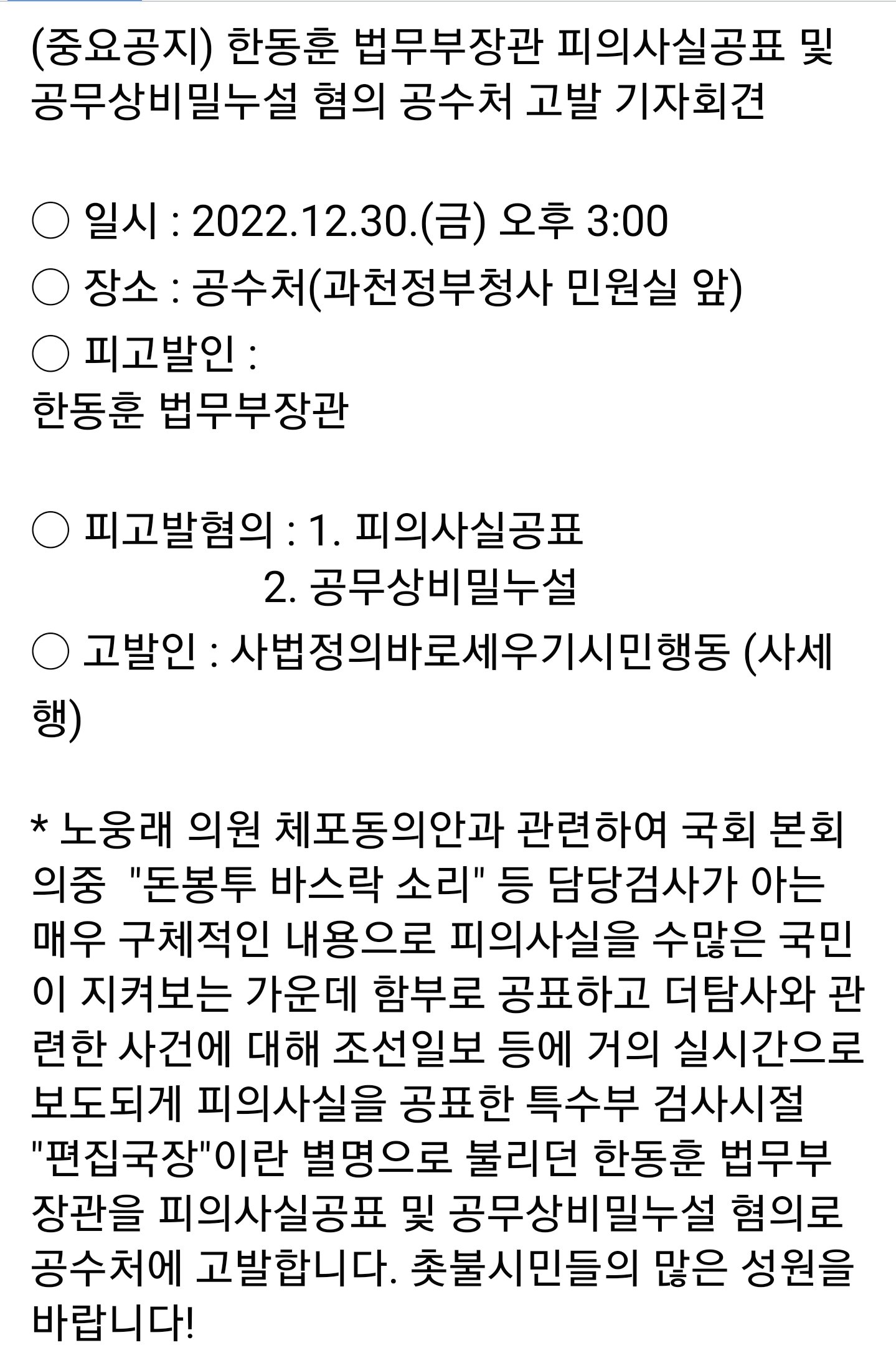 한동훈 법무부 장관 피의사실 공표 및 공무상 비밀 누설 혐의 공수처 고발 News2022. 12. 31. 09:32