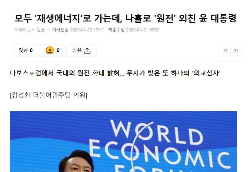 언론사별 뉴스>최신뉴스 뉴스: 다보스포럼에서 국내외 원전 확대 밝혀... 무지가 빚은 또 하나의 '외교참사' [김성환 더불어민주당 의원] ▲ 윤석열 대통령이 19일(현지시간) 스위스 다보스에서