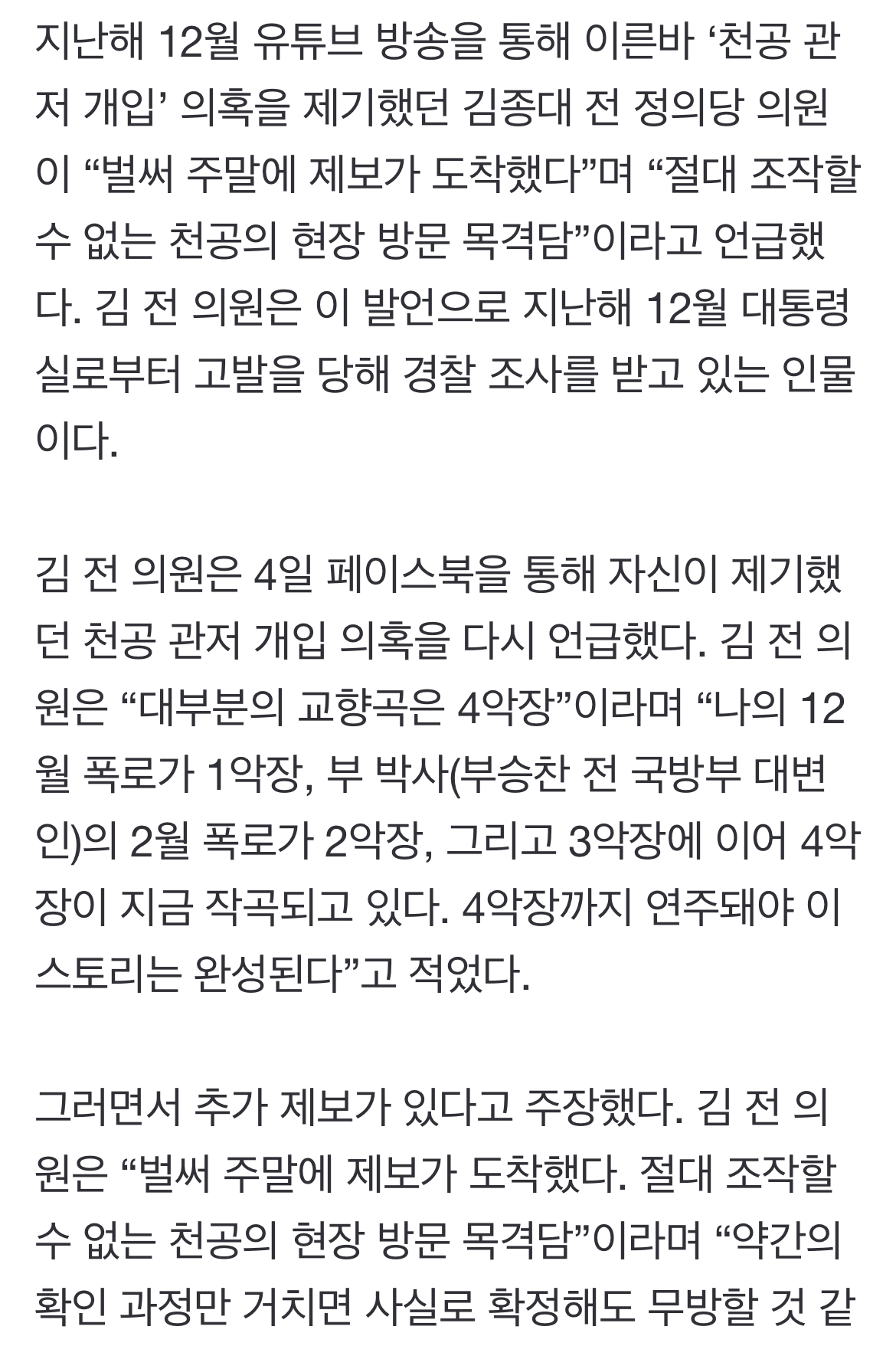 지난해 12월 유튜브 방송을 통해 이른바 ‘천공 관저 개입’ 의혹을 제기했던 김종대 전 정의당 의원이 “벌써 주말에 제보가 도착했다”며 “절대 조작할 수 없는 천공의 현장 방문 목격담”이