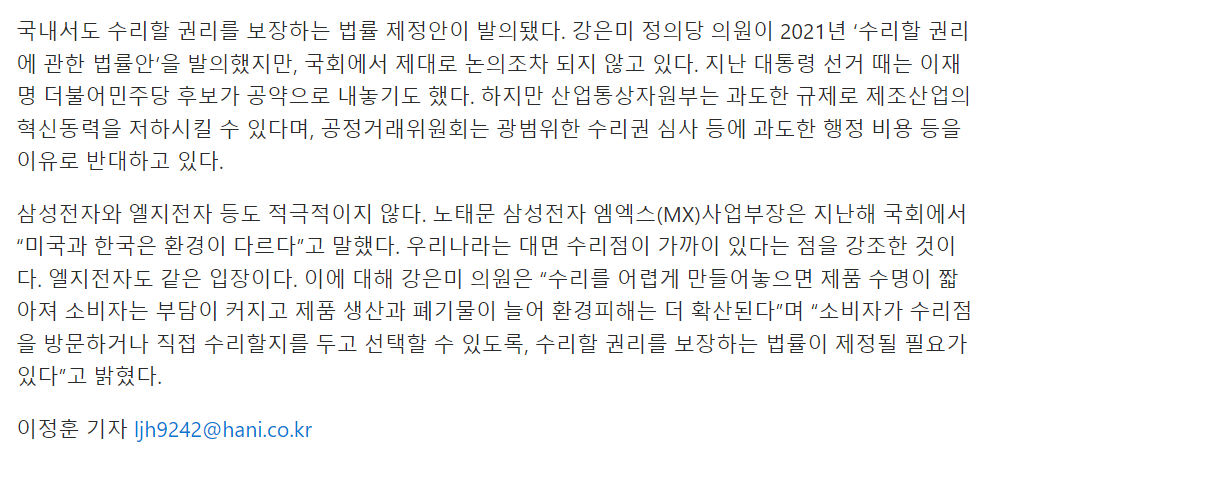 강은미 정의당 의원이 2021년 ‘수리할 권리에 관한 법률안’을 발의했지만 News2023. 2. 16. 08:58