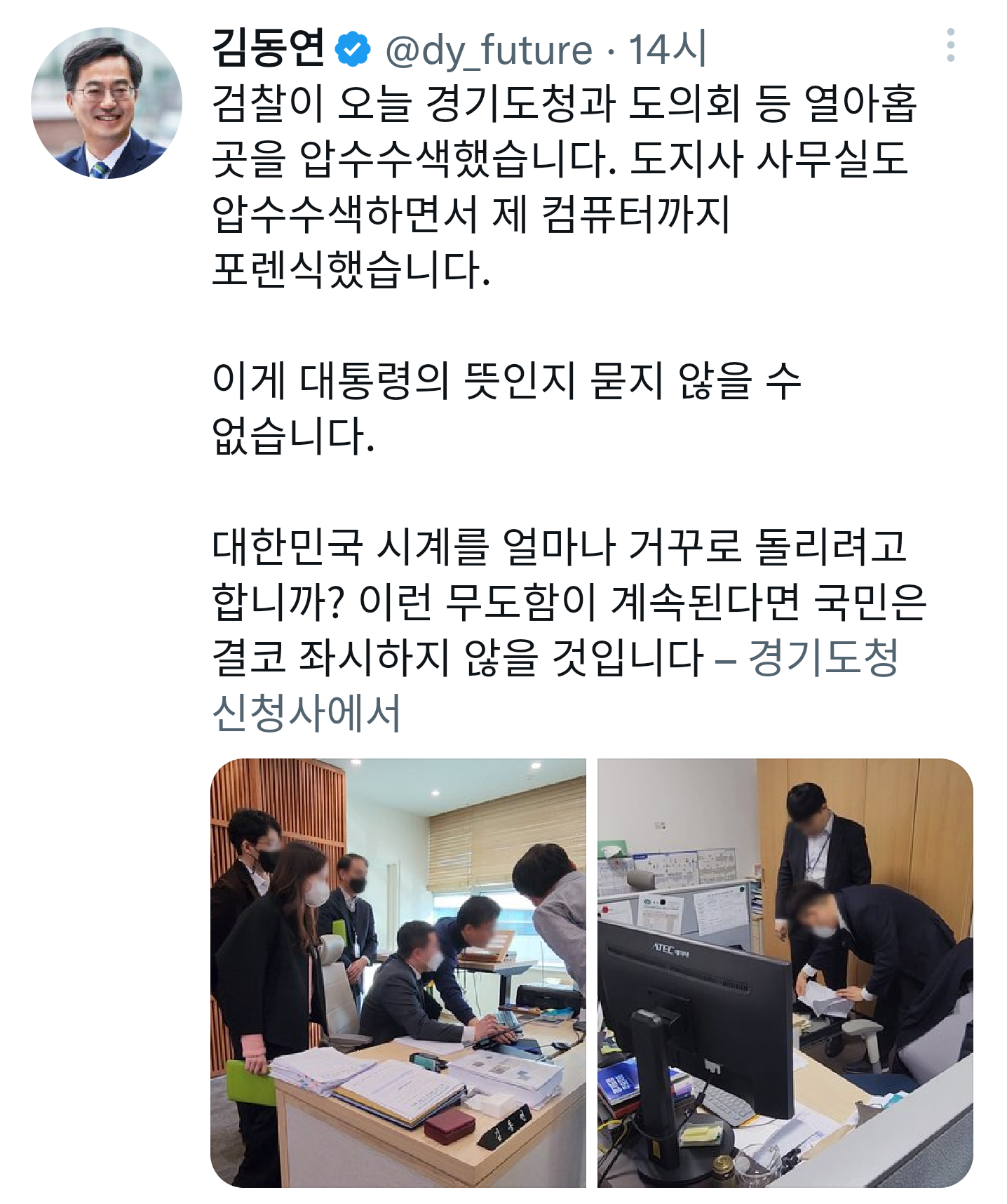 “검찰이 오늘 경기도청과 도의회 등 열아홉 곳을 압수수색했습니다. 도지사 사무실도 압수수색하면서 제 컴퓨터까지 포렌식했습니다. 이게 대통령의 뜻인지 묻지 않을 수 없습니다. 대한민국