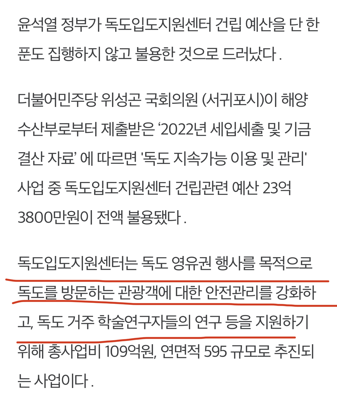 윤석열 정부가 독도입도지원센터 건립 예산을 단 한 푼도 집행하지 않고 불용한 것으로 드러났다 .더불어민주당 위성곤 국회의원 (서귀포시)이 해양수산부로부터 제출받은 ‘2022년 세입세출 및