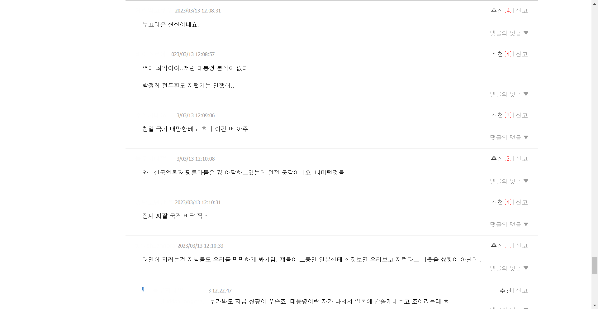 | 오늘자 리얼미터 .. 긍정은 "60대" 만 상승, 부정은 전 영역에서 상승 2023년 3월 11일 (0) | 2023.03.13 |