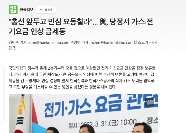 "총선 앞두고 민심 요동칠라"... 與, 당정서 가스·전기요금 인상 급제동 News2023. 3. 31. 23:35