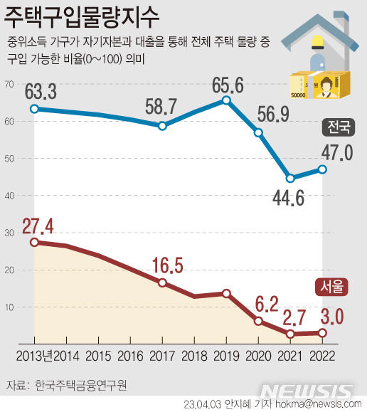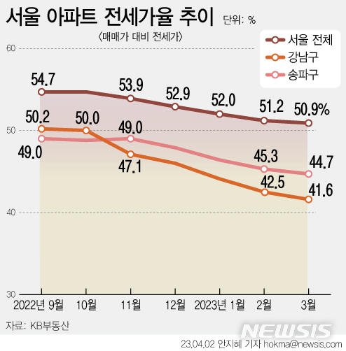 ◆ 서울 전셋값 '매맷값의 50% 수준' …11년 만에 최저 KB부동산에 따르면 지난 3월 서울의 매매가 대비 전세가 비율인 전세가율은 50.9%로 2011년12월(50.8%) 이후 11년3개월 만에 가장 낮은 수치를 기록