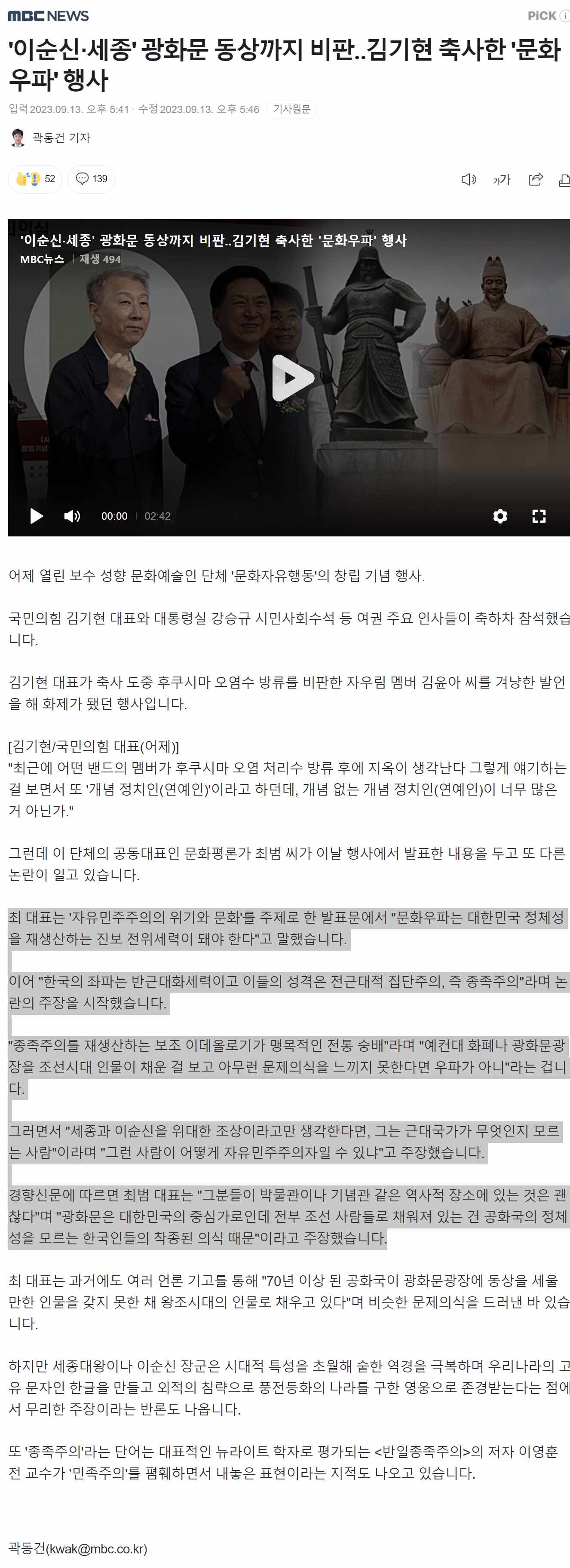 “광화문광장을 조선시대 인물이 채우고 있는 것을 보고 아무런 문제의식을 느끼지 못하는 사람을 나는 우파라고 생각하지 않는다.” 김기현 국민의힘 대표가 창립을 축하한 문화예술인 단체