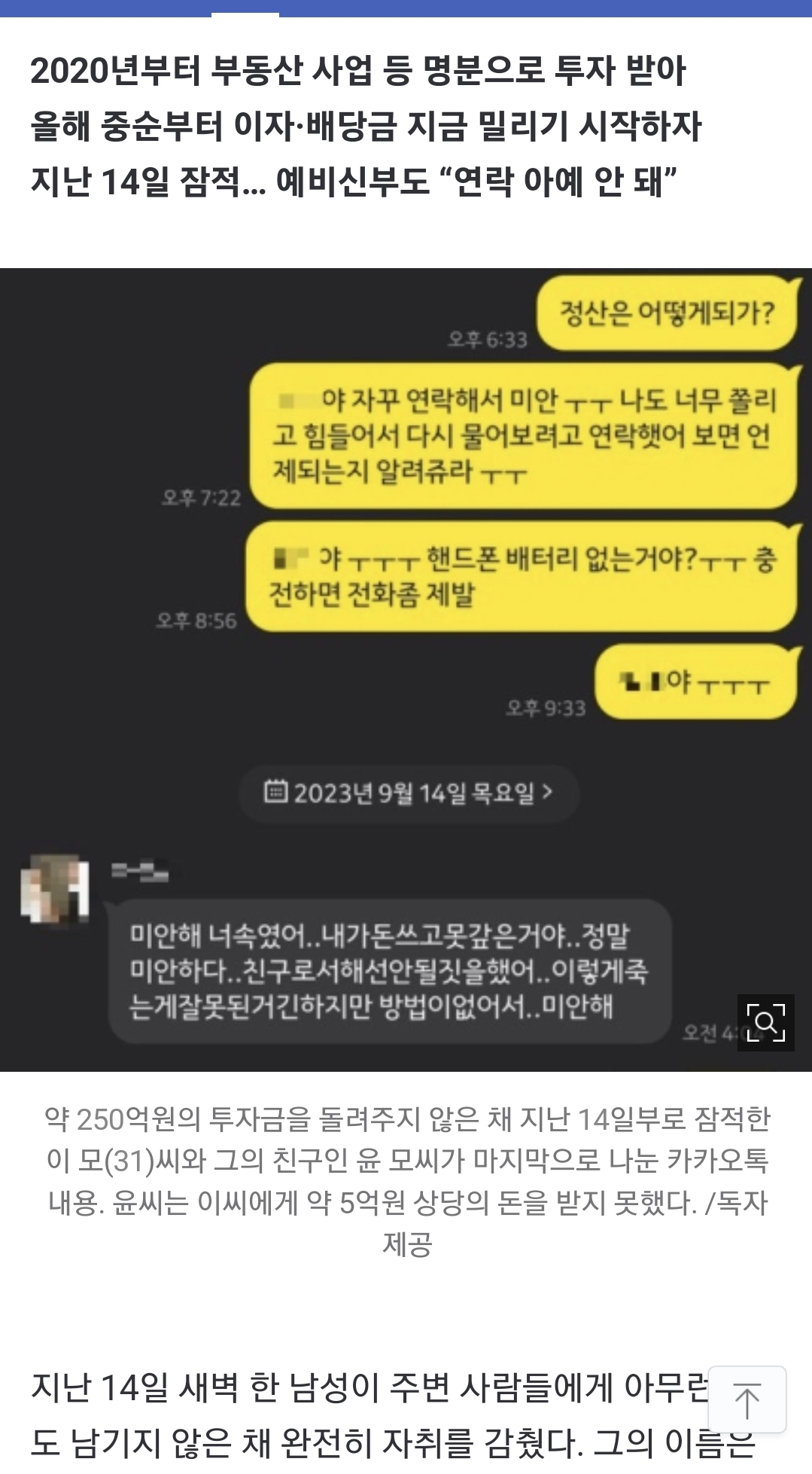 2020년부터 부동산 사업 등 명분으로 투자 받아 올해 중순부터 이자·배당금 지금 밀리기 시작하자 지난 14일 잠적… 예비신부도 “연락 아예 안 돼” 지난 14일 새벽 한 남성이 주변 사람들에게