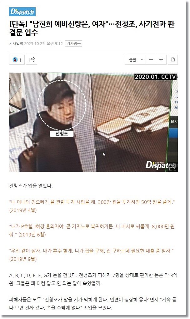 디스패치 특정, 남현희 예비신랑은, "천정조,,,, News2023. 10. 25. 09:32