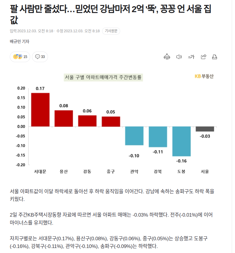 팔 사람만 줄섰다…믿었던 강남마저 2억 '뚝', 꽁꽁 언 서울 집값 2023년 12월 News2023. 12. 3. 11:25