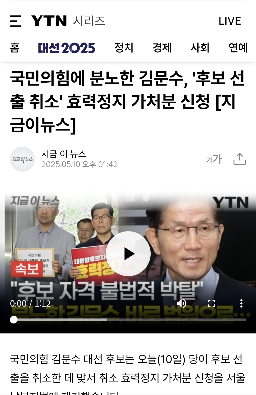 국민의 힘에 분노한 김문수, 후보 박탈 무효 즉각 가처분 News2025. 5. 10. 16:26