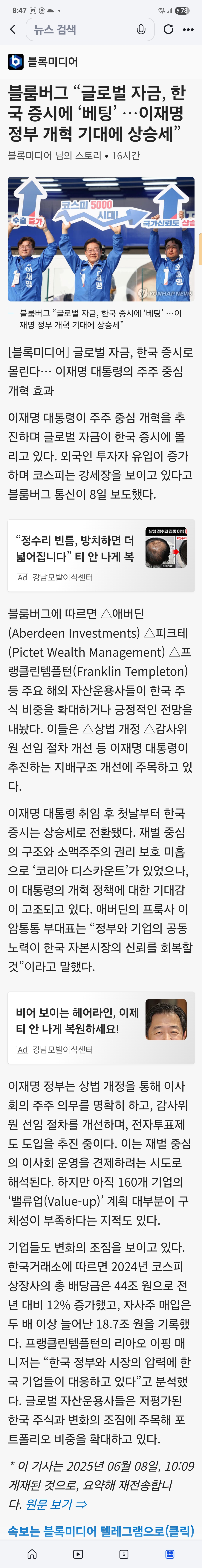 블룸버그 “글로벌 자금, 한국 증시에 ‘베팅’ …이재명 정부 개혁 기대에 상승세” News2025. 6. 9. 20:49