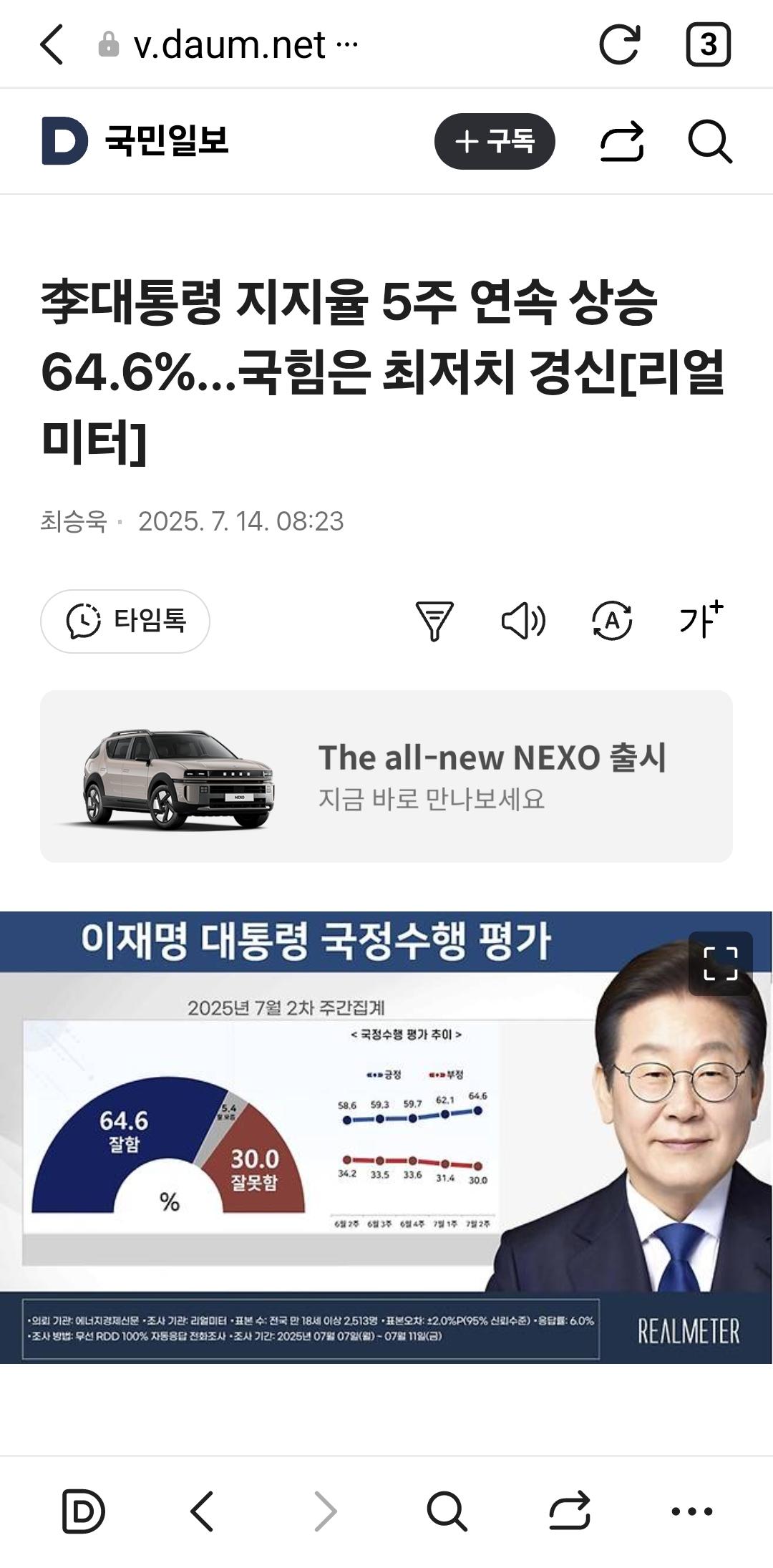 李대통령 지지율 64.6% 5주째 상승···국힘, 24.3%로 역대 최저 [리얼미터] News2025. 7. 14. 09:25