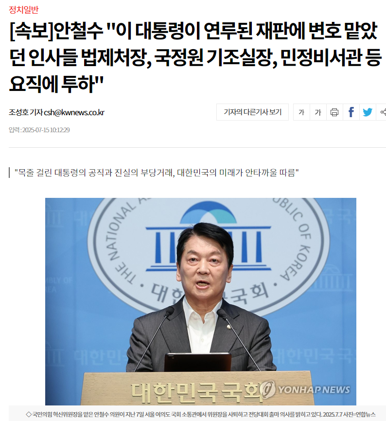 속보]안철수 "이 대통령이 연루된 재판에 변호 맡았던 인사들 요직에 투하" News2025. 7. 15. 10:55