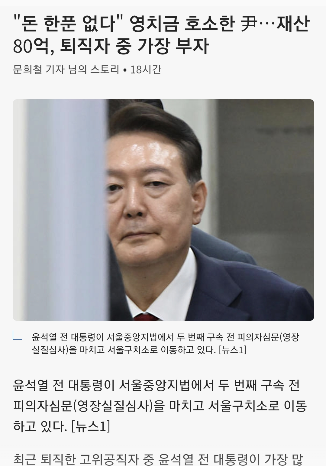 돈 한푼 없다" 영치금 호소한 尹…재산 80억, 퇴직자 중 가장 부자 News2025. 7. 25. 18:23