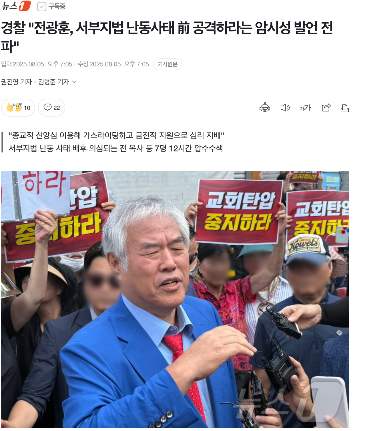 경찰 "전광훈, 서부지법 난동사태 前 공격하라는 암시성 발언 전파" News2025. 8. 6. 10:39