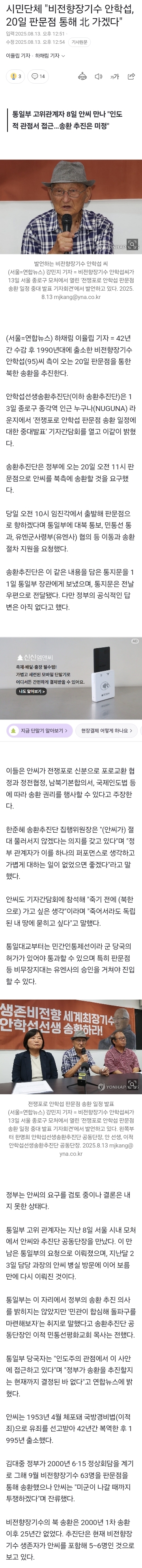 시민단체 비전향장기수, 20일 판문점 통해 북 가겠다. 알고보니 News2025. 8. 13. 15:00