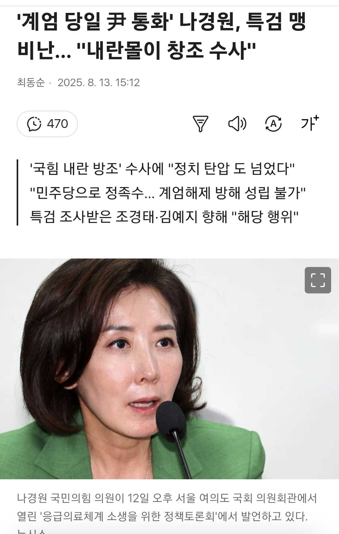계엄 당일 尹 통화' 나경원, 특검 맹비난… "내란몰이 창조 수사" News2025. 8. 13. 16:20