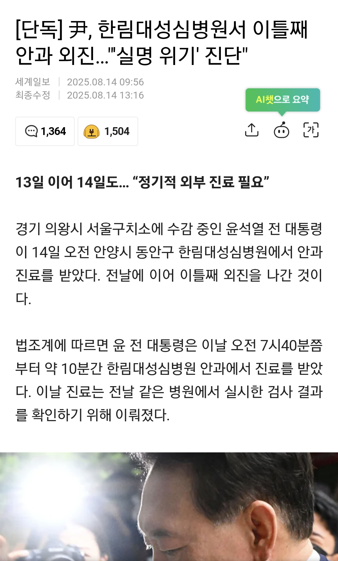 尹, 한림대성심병원서 이틀째 안과 외진…"'실명 위기' 진단" News2025. 8. 14. 17:51