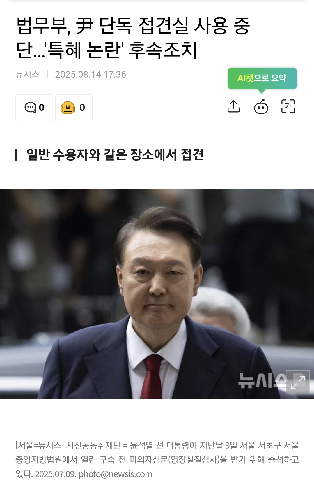 법무부, 尹 단독 접견실 사용 중단…'특혜 논란' 후속조치 News2025. 8. 14. 18:01