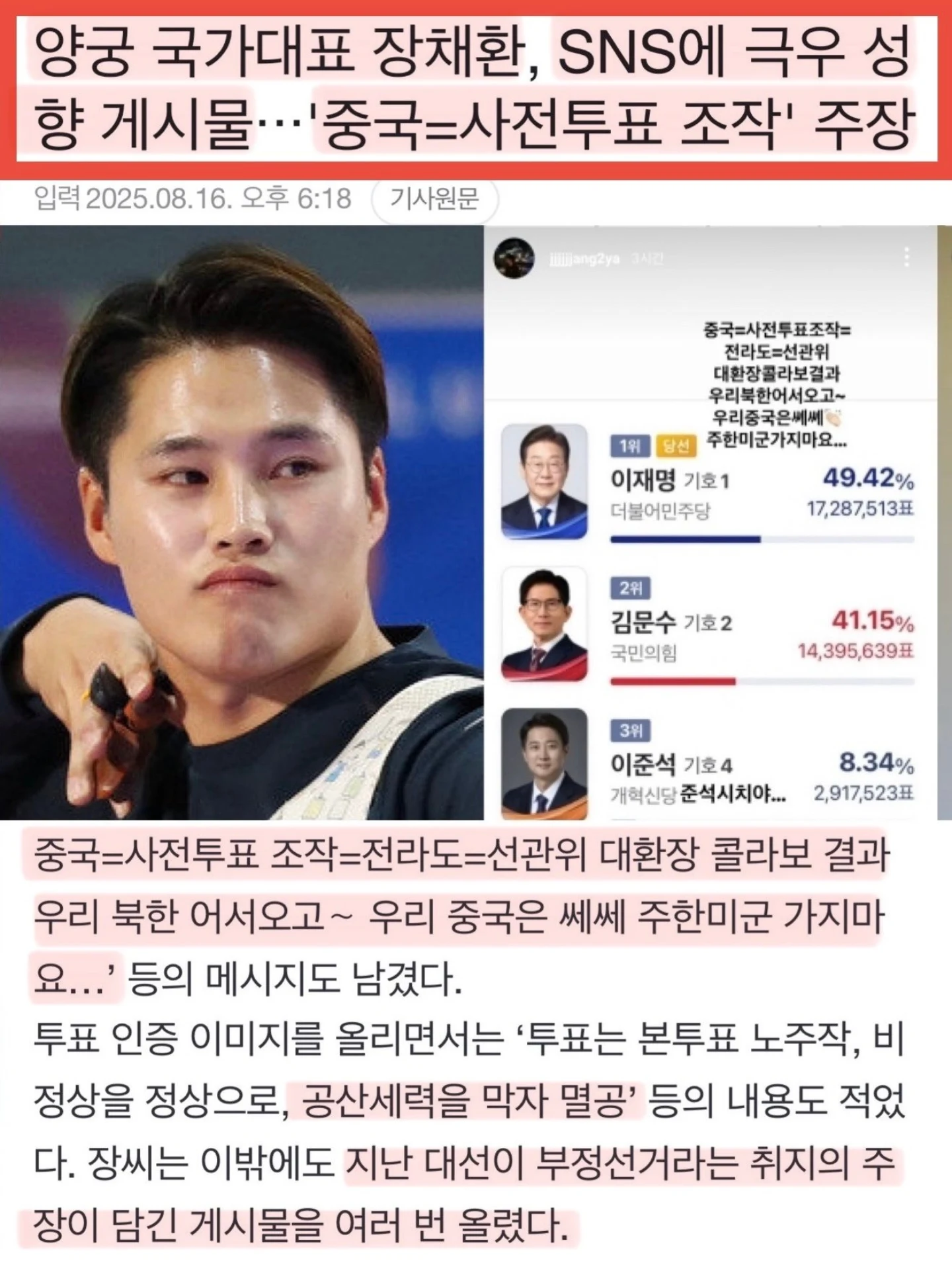 국가대표 양궁선수가 SNS에 '대선 조작' 게시물 반복적으로 올려 News2025. 8. 17. 11:55
