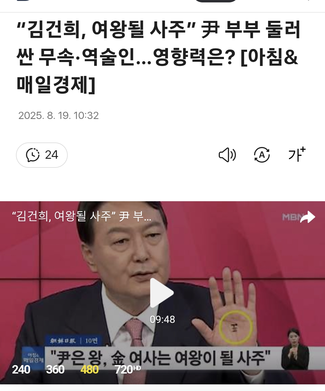 - MBN 유튜브/뉴스: “김건희, 여왕될 사주 尹 부부 둘러싼 무속·역술인…영향력은?”, 2025-08-18youtube