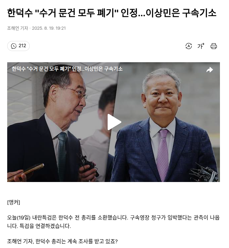 한덕수 "수거 문건 모두 폐기" 인정…이상민은 구속기소 News2025. 8. 20. 01:25
