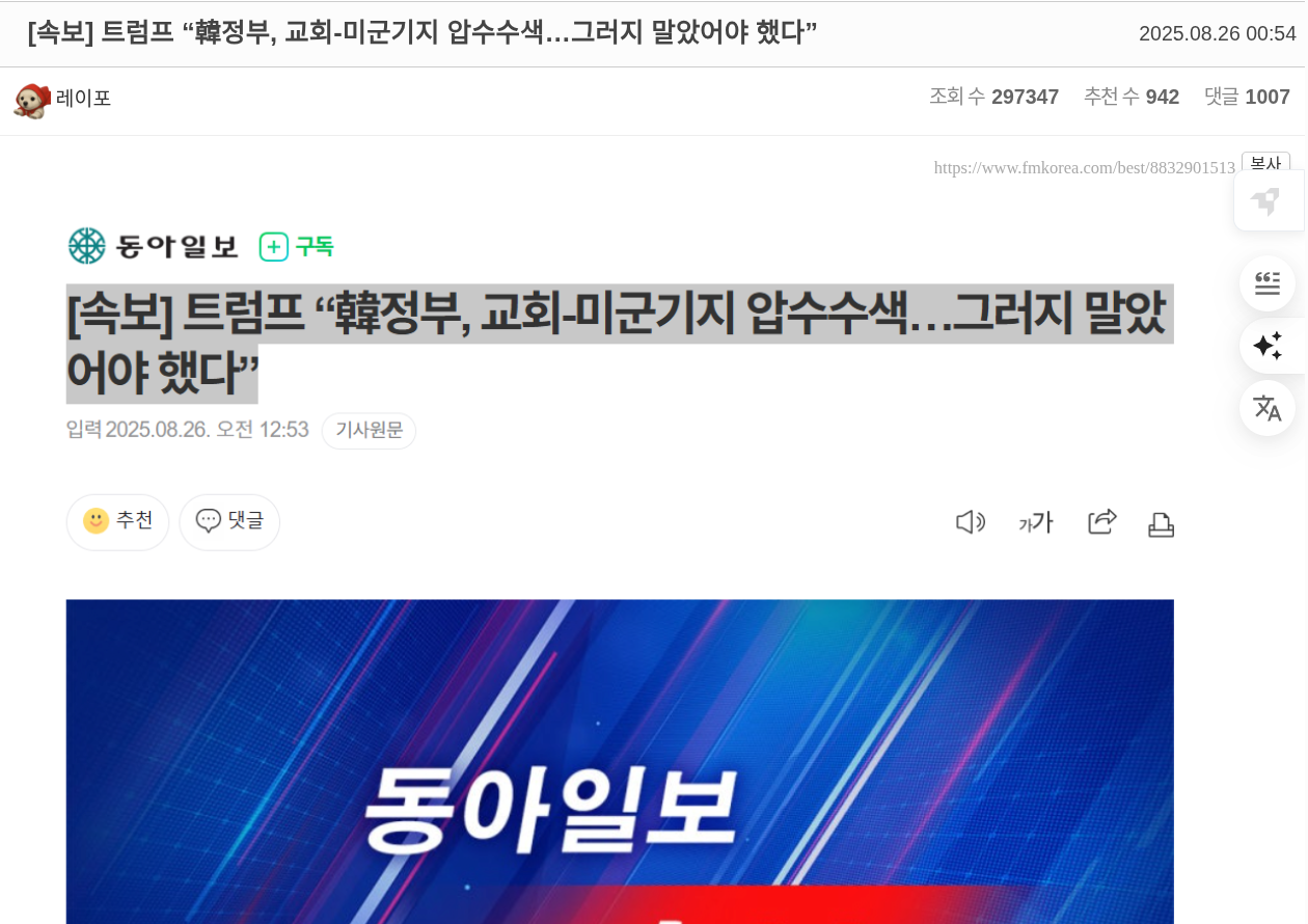 트럼프, 교회 압수수색..오해 했다. 그러나 동아일보 보도 수준 News2025. 8. 26. 03:01