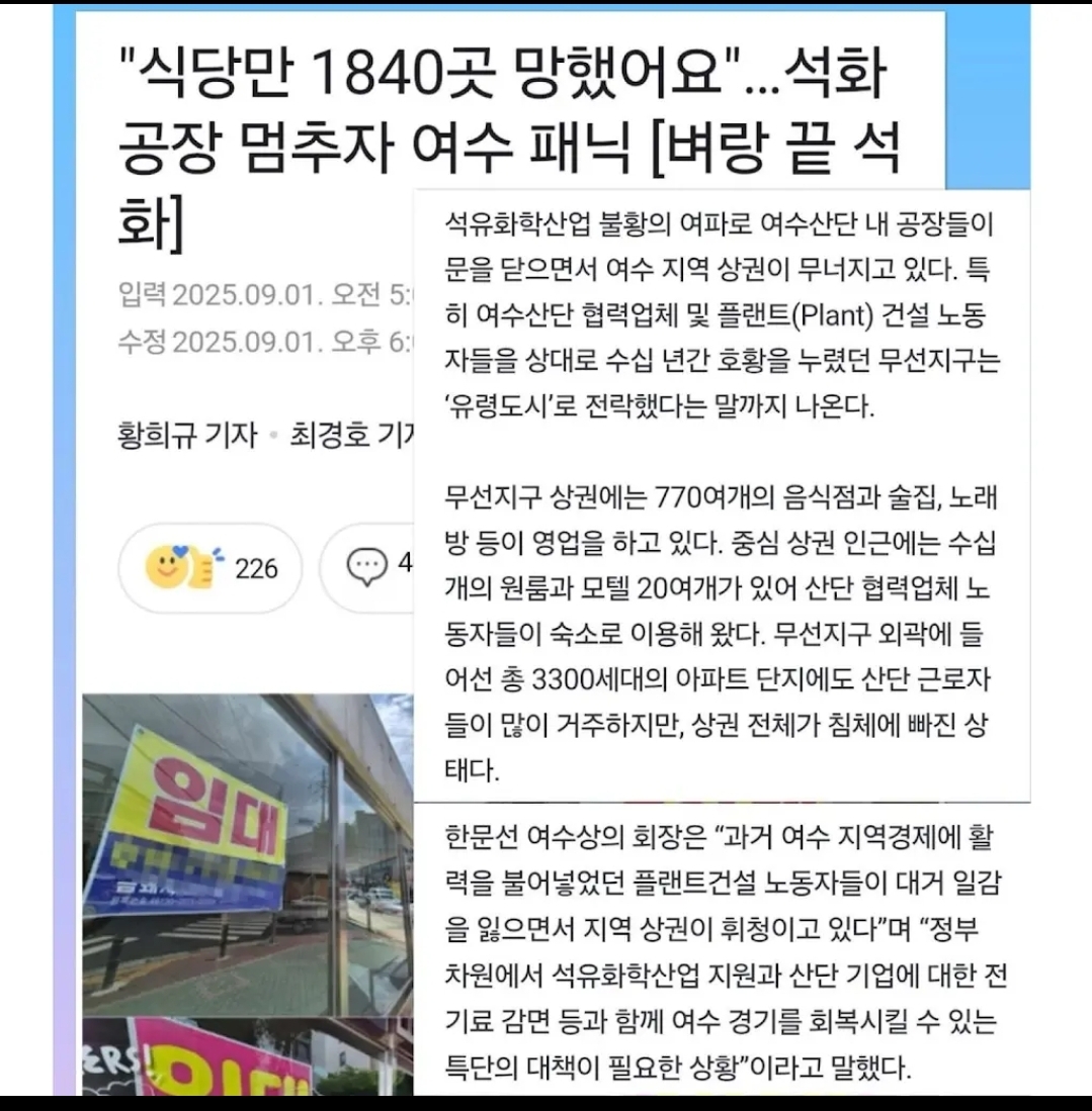 여수, 석화(석유화학산업) 불황 여파, 식당만 1840곳 망했,,, News2025. 9. 3. 09:00