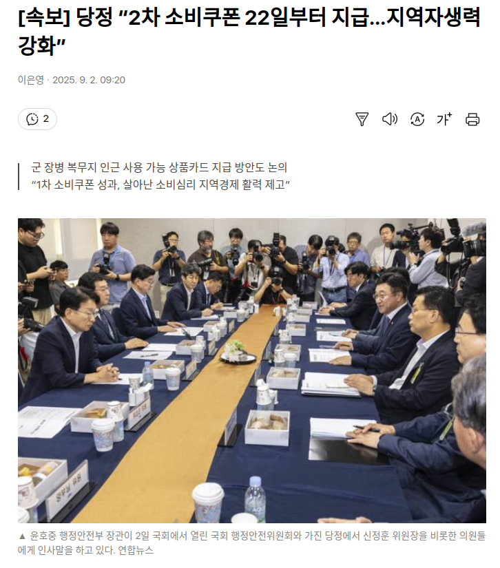 당정 “2차 소비쿠폰 22일부터 지급…지역자생력 강화” News2025. 9. 3. 18:14