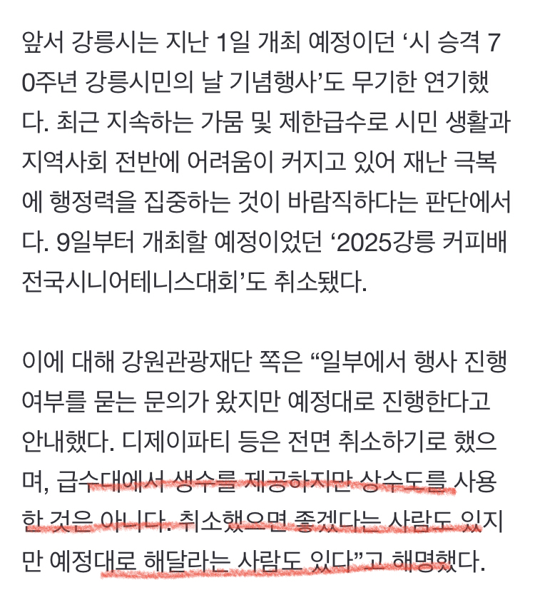 극심한 가뭄으로 재난사태까지 선포된 강릉에서 1천명이 참가하는 대규모 달리기 행사가 열릴 예정이라 논란이 일고 있다. 강원도 출연기관인 강원관광재단은 오는 6일 오후 4시 강원도 강릉시