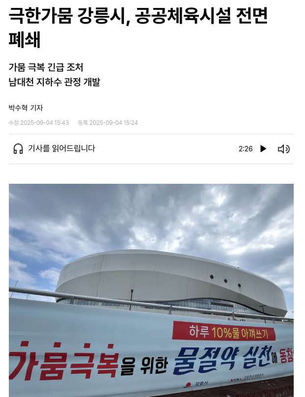 극한가뭄 강릉시, 공공체육시설 전면 폐쇄 News2025. 9. 4. 17:01