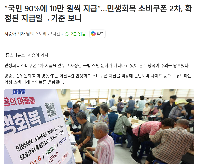 민생회복 소비쿠폰 2차 지급을 앞두고 사칭한 불법 스팸 문자가 나타나고 있어 관계 당국이 주의를 당부했다.방송통신위원회(이하 방통위)는 이달 4일 민생회복 소비쿠폰 지급을 악용해 불법도