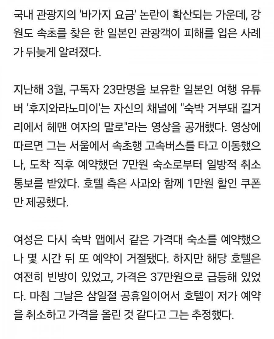 [헤럴드경제=김성훈 기자] 일본의 한 여행 유튜버가 강원도 속초 여행 중 예약한 호텔을 일방적으로 취소당했다는 사연이 온라인상에서 뒤늦게 관심을 끌고 있다. 4일 온라