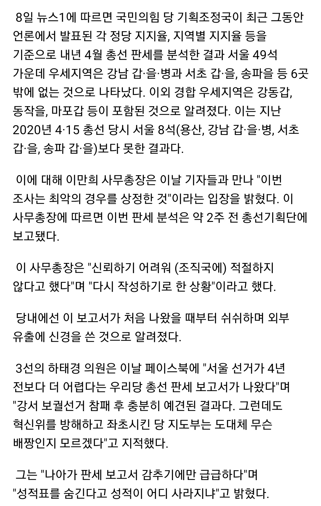 국민의 힘, 서울 49석 가운데 우세지역은 강남 갑·을·병과 서초 갑·을, 송파을 등 6곳 2023년 12월 News2023. 12. 9. 17:56