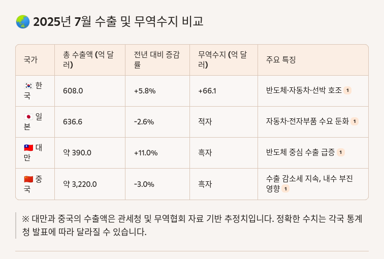 2025년 7월 한국, 일본, 대만, 중국의 수출 및 무역수지 현황
