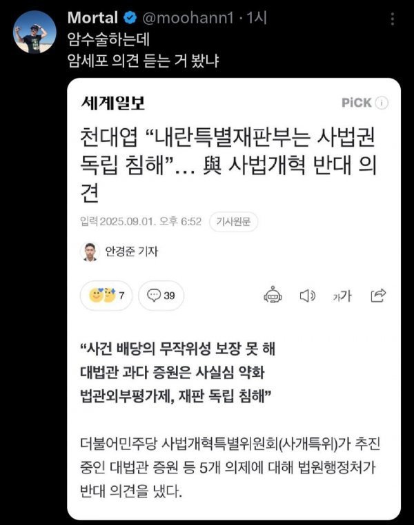 천대엽 법원행정처장 "내란 특별재판부, 사법부 독립 침해 소지", 암세포 수술하는데 암세포 의견?