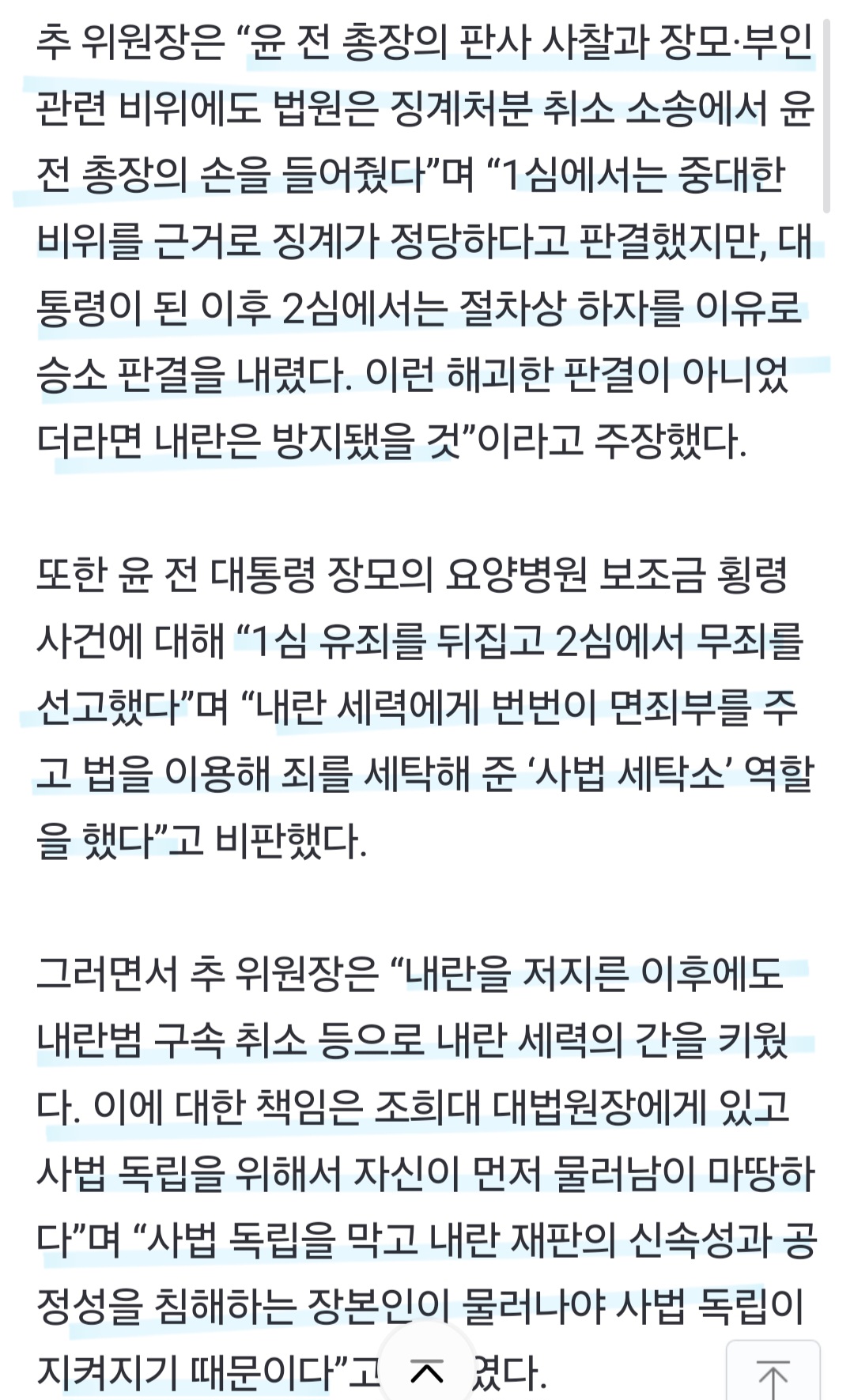 추미애 “대법원장, 검찰 독재에서는 침묵하다가 사법부 독립 주장”