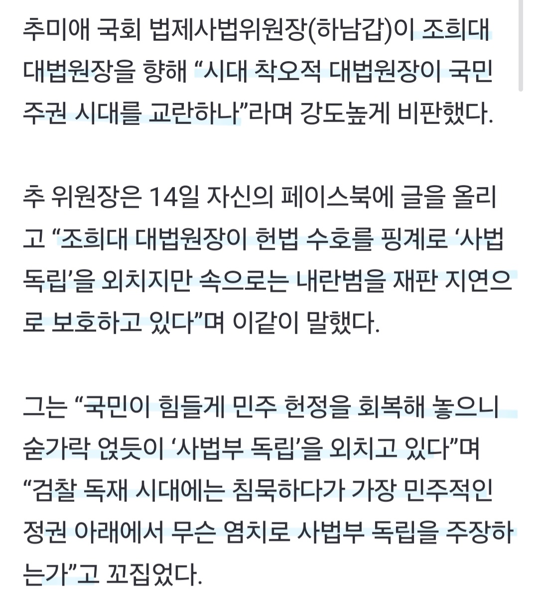 추미애 국회 법제사법위원장(하남갑)이 조희대 대법원장을 향해 “시대 착오적 대법원장이 국민주권 시대를 교란하나”라며 강도높게 비판했다. 추 위원장은 14일 자신의 페이스북에 글을 올