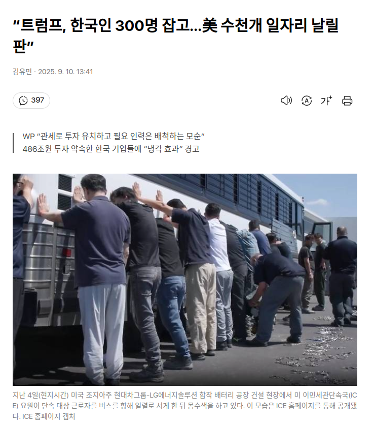 美 조지아 현대차-LG 배터리 공장서 사상 최대 이민 단속 News2025. 9. 15. 13:21