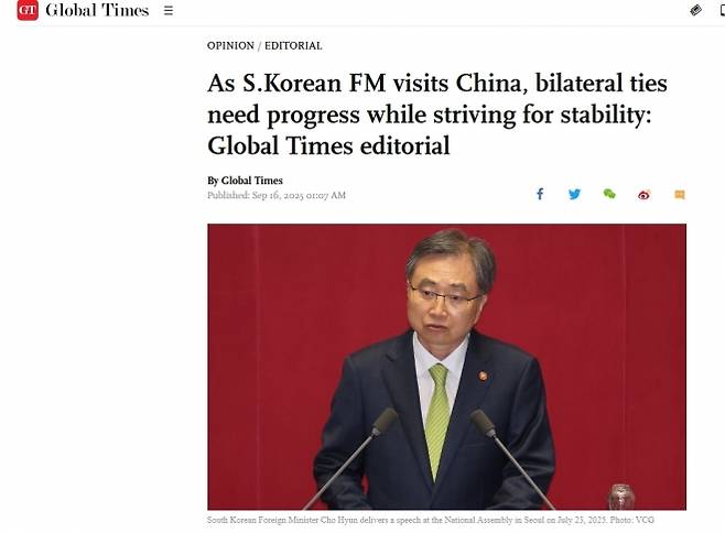 [서울신문 나우뉴스] 조현 외교부 장관이 17일 중국을 방문해 한중 외교장관 회담을 열 예정인 가운데, 중국 관영매체가 자세한 평가를 담은 사설을 내놓았다. 중국 영문 관영매체 글로벌타임스