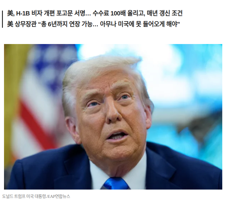 트럼프 행정부가 ‘전문직 비자’로 불리는 H-1B 비자 수수료를 현행의 100배 수준인 1인당 연간 10만달러(약 1억4000만원)로 대폭 인상했다. News2025. 9. 20. 13:17