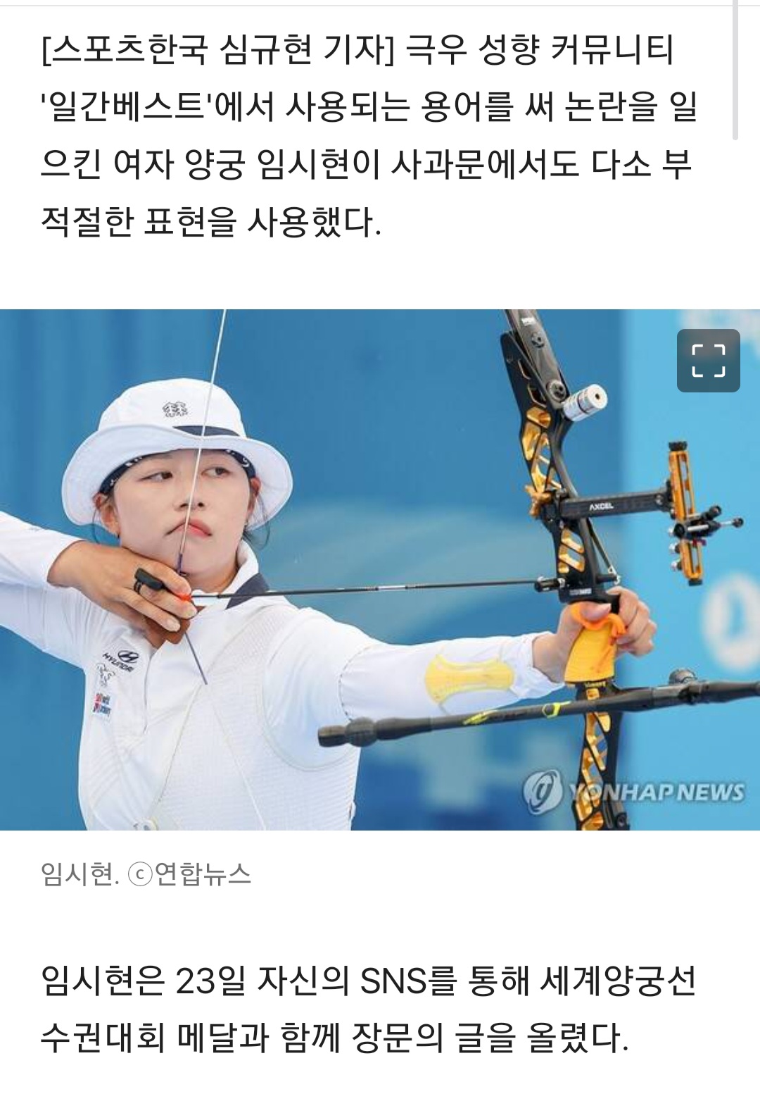 [아이뉴스24 김동현 기자] 과거 '극우 표현 논란'에 휘말린 양궁 국가대표 선수 임시현이 사과문을 게재했다. 그러나 최초 사과문 일부 내용을 두고 누리꾼들의 질타가 이어지고 있다. 임시현은 2